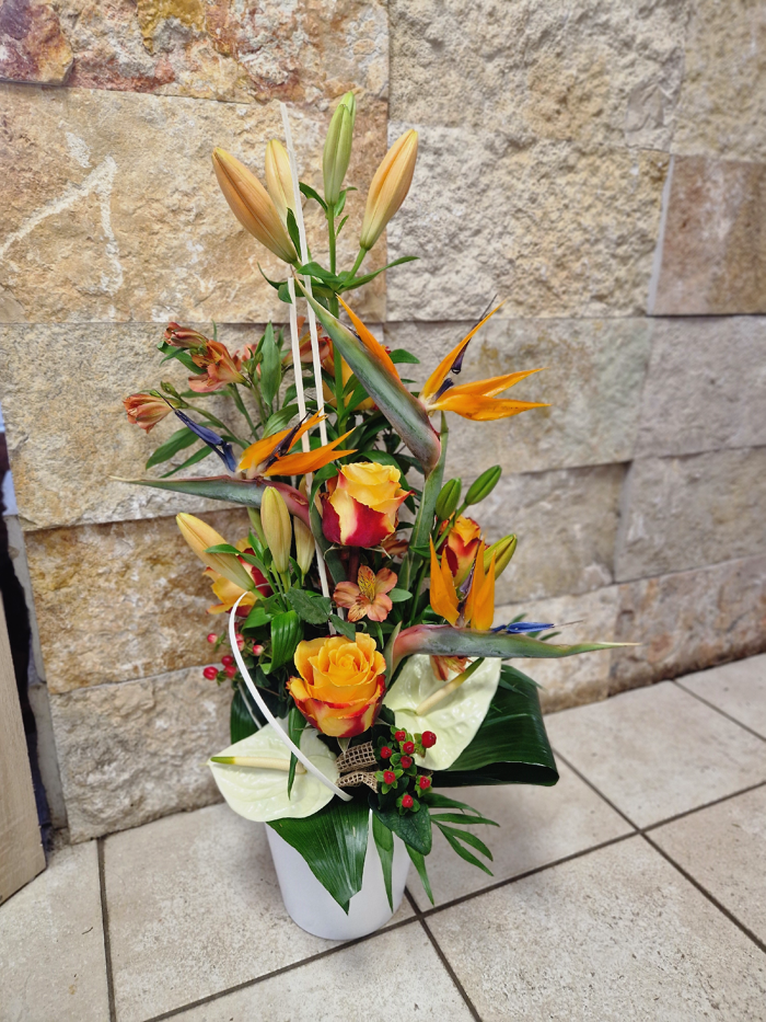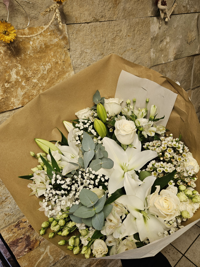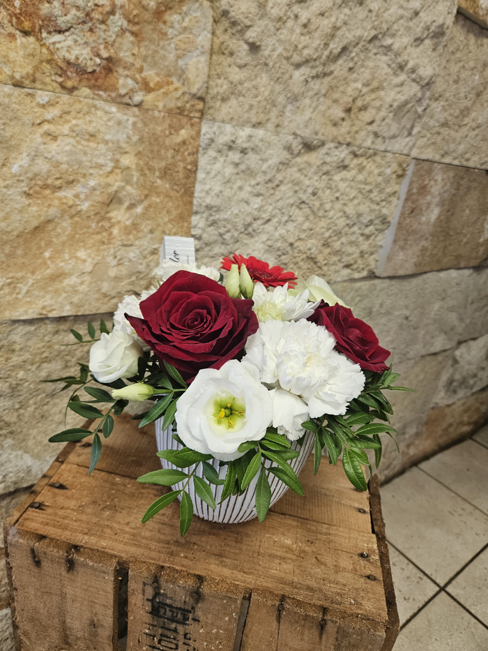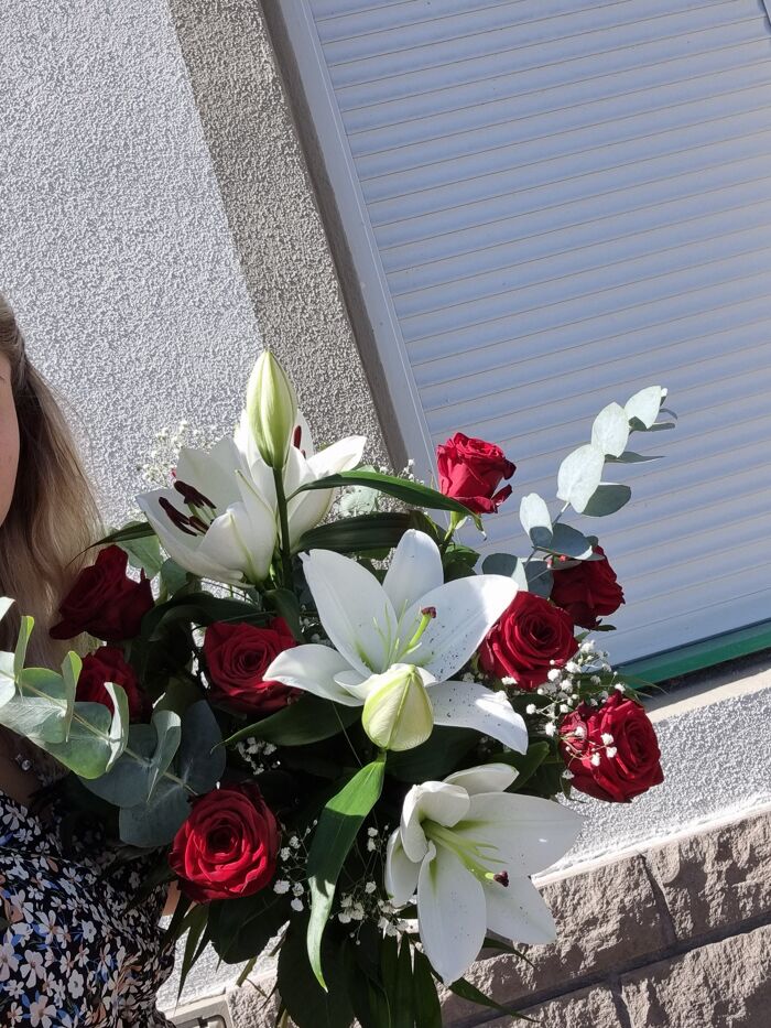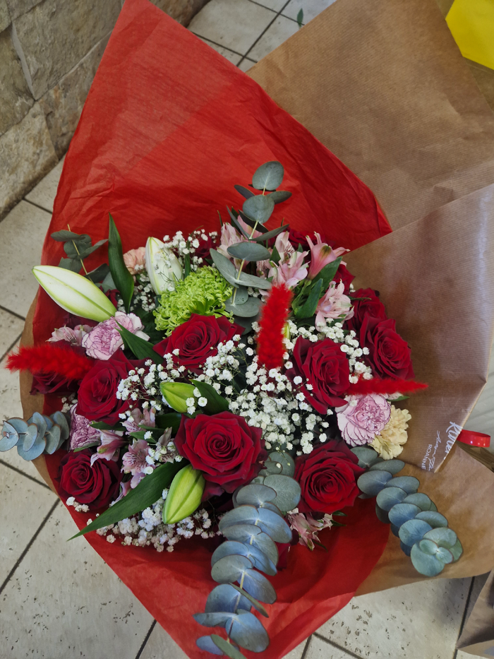 Magnifique bouquet de 9 rose Rouge gros bouton avec lys blanc + feuillage